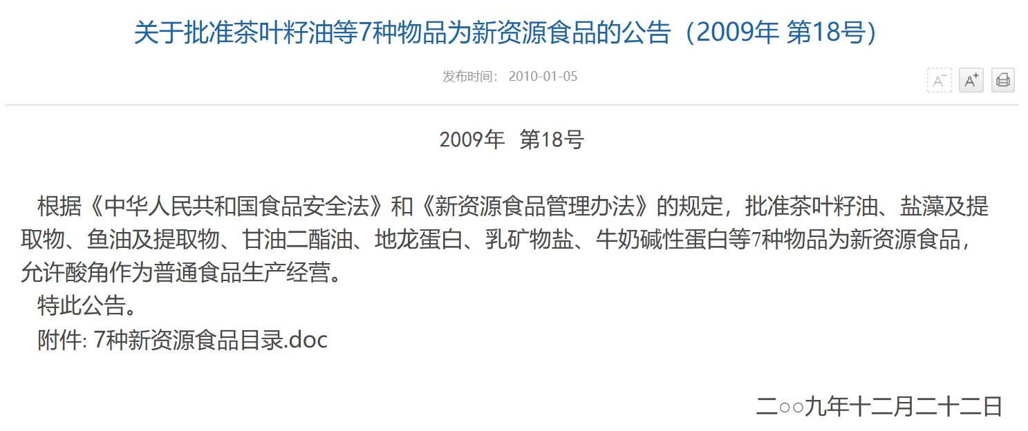 關(guān)于批準(zhǔn)茶葉籽油等7種物品為新資源食品的公告(2009年 第18號)