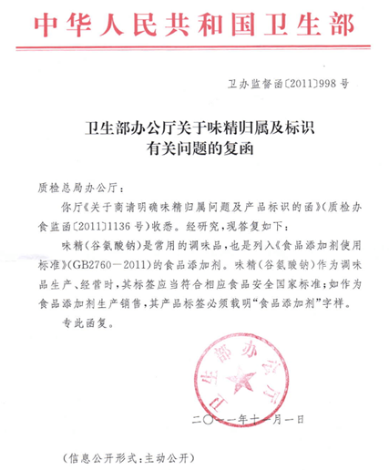 附件:衛(wèi)生部辦公廳關(guān)于味精歸屬及標(biāo)識有關(guān)問題的復(fù)函